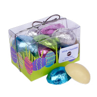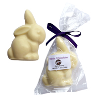 A classic Easter favorite — made safe for allergy families. This 5.4oz Solid White Chocolate Bunny stands about 7¼" tall and is crafted from smooth, creamy white chocolate. Each bunny is tucked a clear cello bag tied with a bright yellow ribbon, ready for baskets and gifting.